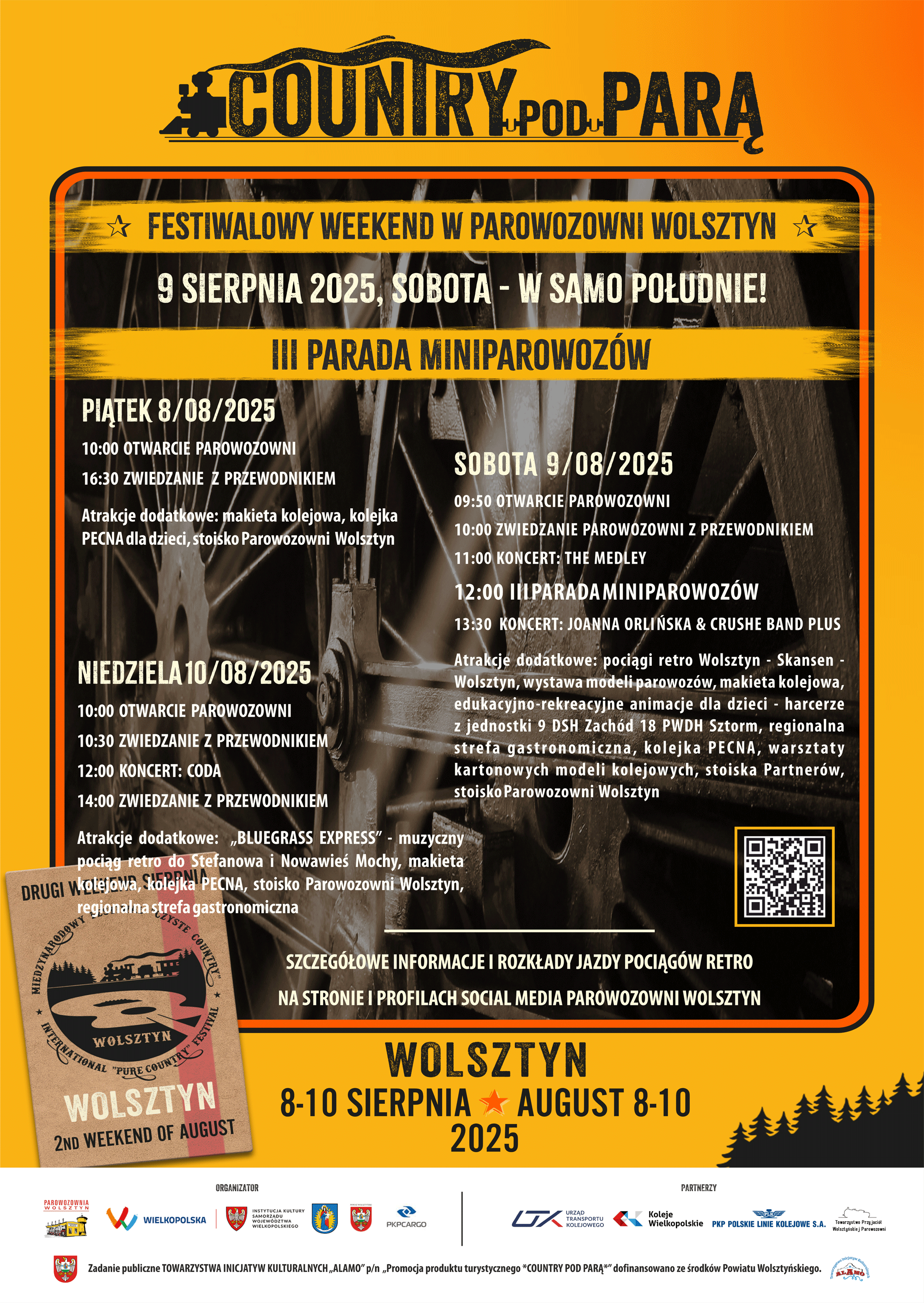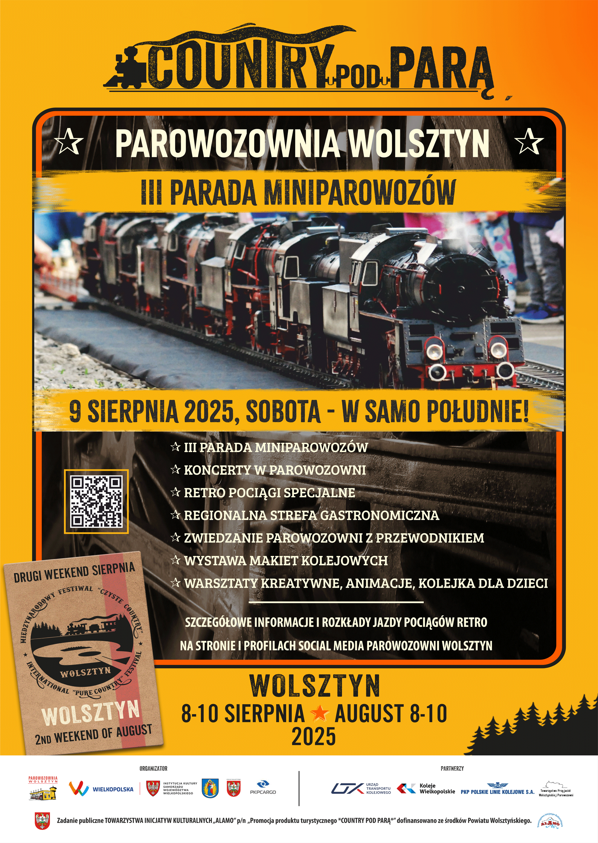 馃殏 "COUNTRY POD PAR膭" , bo KA呕DA SZYNA PROWADZI DO WOLSZTYNA! - Parowozownia Wolsztyn: Parada Miniparowoz贸w, poci膮gi retro z parowozem, w tym "BLUEGRASS EXPRESS" z Piotr Bu艂as & Garage Folks na pok艂adzie, koncerty w Parowozowni